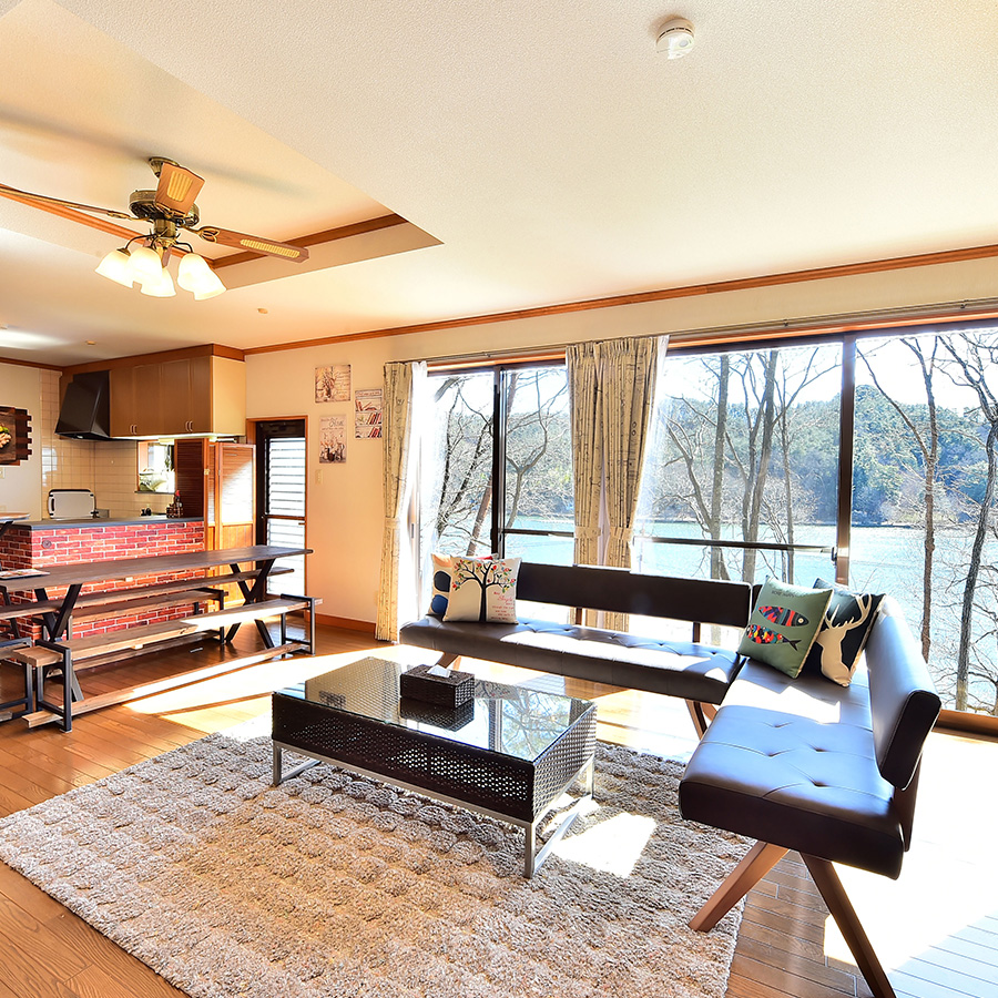 広々としたリビングダイニングの大きな窓からはキラキラ輝く湖面。リビングには大型チューナーレスTV、高めの天井にはシーリングファンを設置。開放的なくつろぎ空間でごゆっくりお過ごしください。