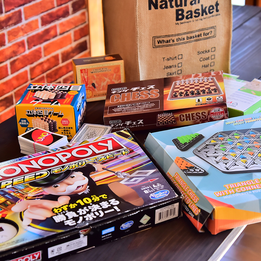 キッチン/バスタブ/机(テーブル)/椅子(ソファ)/ベッド・布団/エアコン/物干し/ハンガー/Wifi/冷蔵庫/洗濯/掃除機/電子レンジ/オーブン・トースター/ケトル/炊飯器/食器類/調理器具類/ラップ/アルミホイル/キッチンペーパー/救急箱/ボードゲーム